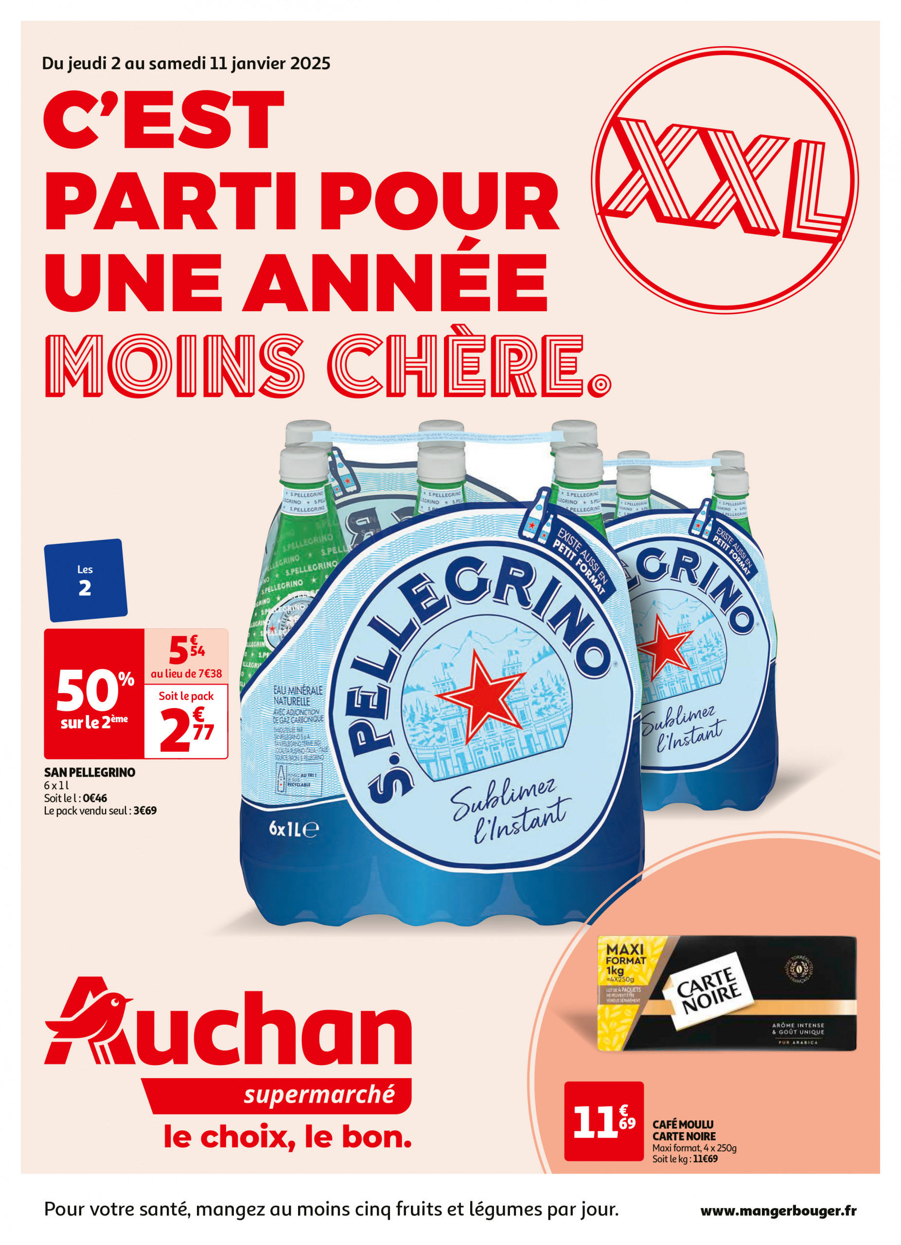 Du 2 au 11 janvier 2025, c’est parti pour une année moins chère ! samedi 04 janvier 2025|Actualités, Auchan supermarché| Du 2 au 11 janvier 2025, c’est parti pour une année moins chère ! Catalogue Auchan, du 2 au 11 janvier 2025 1 fichier·s 6.06 MB Télécharger Partagez cette page sur les réseaux sociaux FacebookXRedditLinkedInWhatsAppTumblrPinterestEmail Articles similaires Du 7 au 11 octobre, le frais, le bon, moins cher ! Du 7 au 11 octobre, le frais, le bon, moins cher ! jeudi 09 octobre 2025 Du 30 septembre au 11 octobre, les Halles d’automne Du 30 septembre au 11 octobre, les Halles d’automne jeudi 09 octobre 2025 Du 16 au 27 septembre, c’est parti pour les petits prix ! Du 16 au 27 septembre, c’est parti pour les petits prix ! lundi 22 septembre 2025 Du 9 au 13 septembre, le frais le bon moins cher chez Auchan ! Du 9 au 13 septembre, le frais le bon moins cher chez Auchan ! mercredi 10 septembre 2025 Du 9 au 27 septembre, c’est la foire aux Vins chez Auchan ! Du 9 au 27 septembre, c’est la foire aux Vins chez Auchan ! mercredi 10 septembre 2025