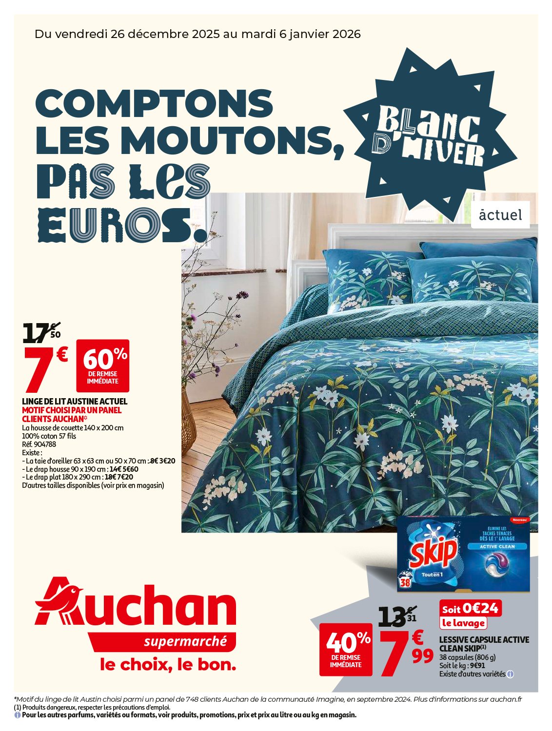 Du 26 décembre 2025 au 6 janvier 2026 lundi 22 décembre 2025|Actualités, Diaporama-accueil, Auchan supermarché| Du 26 décembre au 6 janvier, c’est le blanc d’hiver ! Plein de promotions sur le linge de lit, de salle de bain, et des réductions jusqu’à 80% sur les lessives ! Télécharger le catalogue Partagez cette page sur les réseaux sociaux FacebookXRedditLinkedInWhatsAppTumblrPinterestEmail Articles similaires Du 16 au 24 décembre 2025 Du 16 au 24 décembre 2025 lundi 22 décembre 2025 Du 16 au 31 décembre 2025 Du 16 au 31 décembre 2025 lundi 22 décembre 2025 Du 9 au 13 décembre 2025 Du 9 au 13 décembre 2025 lundi 22 décembre 2025 Du 2 au 6 décembre 2025 Du 2 au 6 décembre 2025 mercredi 03 décembre 2025 Du 25 novembre au 11 décembre 2025 Du 25 novembre au 11 décembre 2025 mercredi 26 novembre 2025