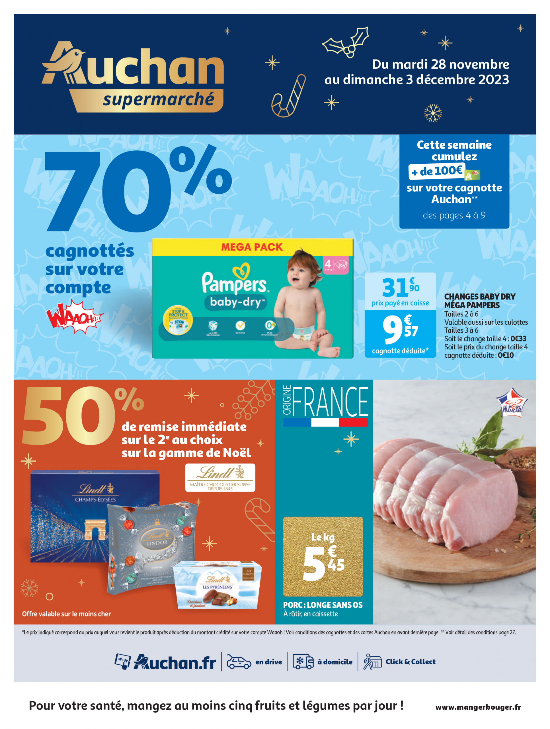Du 28 novembre au 3 décembre 2023 dimanche 26 novembre 2023|Actualités, Auchan supermarché| Du 28 novembre au 3 décembre, 70% cagnottés et 50% sur le 2eme article au choix gamme de Noël Catalogue du 28 novembre au 3 décembre 2023 1 fichier·s 9.91 MB Télécharger Partagez cette page sur les réseaux sociaux FacebookXRedditLinkedInWhatsAppTumblrPinterestEmail Articles similaires Du 7 au 11 octobre, le frais, le bon, moins cher ! Du 7 au 11 octobre, le frais, le bon, moins cher ! jeudi 09 octobre 2025 Du 30 septembre au 11 octobre, les Halles d’automne Du 30 septembre au 11 octobre, les Halles d’automne jeudi 09 octobre 2025 Du 16 au 27 septembre, c’est parti pour les petits prix ! Du 16 au 27 septembre, c’est parti pour les petits prix ! lundi 22 septembre 2025 Du 9 au 13 septembre, le frais le bon moins cher chez Auchan ! Du 9 au 13 septembre, le frais le bon moins cher chez Auchan ! mercredi 10 septembre 2025 Du 9 au 27 septembre, c’est la foire aux Vins chez Auchan ! Du 9 au 27 septembre, c’est la foire aux Vins chez Auchan ! mercredi 10 septembre 2025